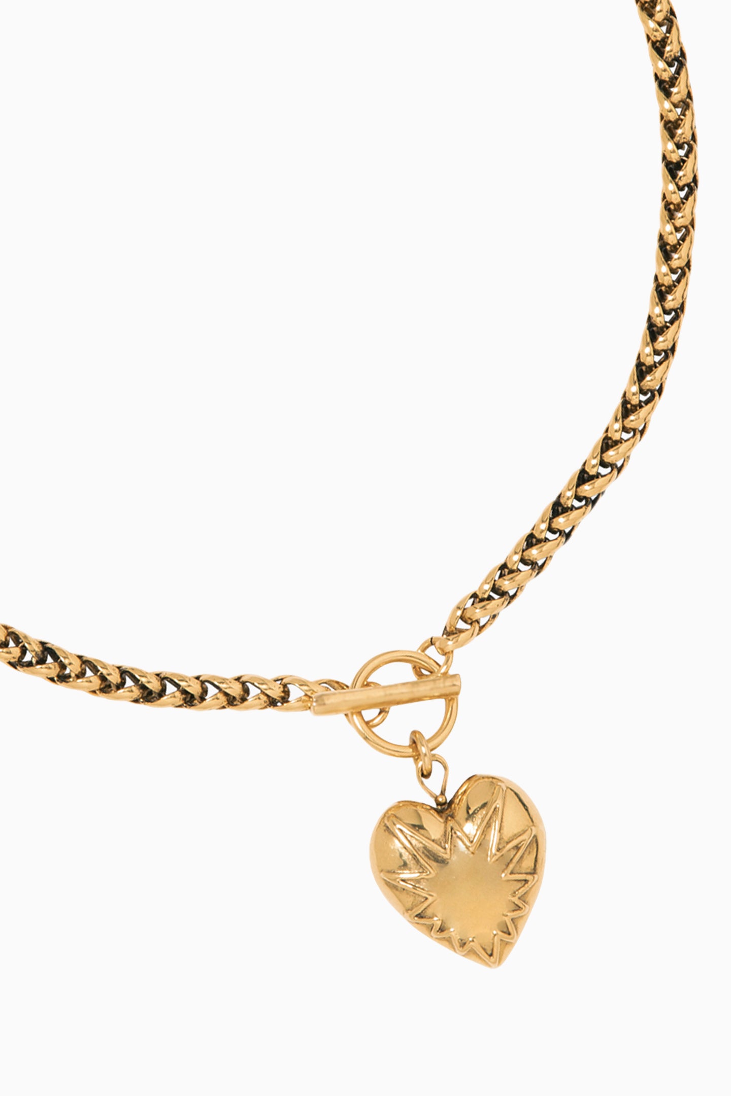 The Jennifer Behr Corazon necklace features a gold-tone wheat chain with a T-bar fastening and a heart shaped pendant.