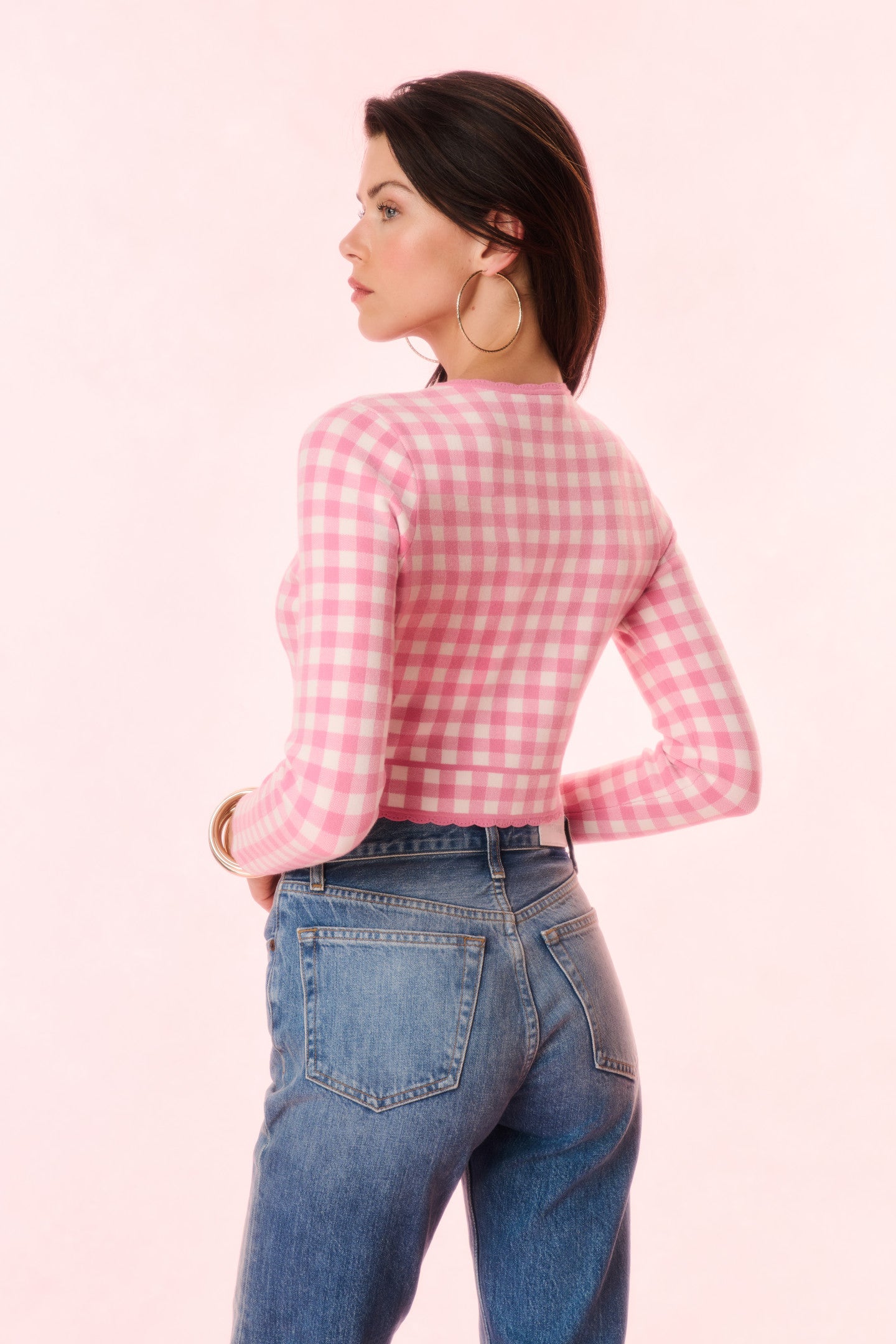 Introducing the Bridgette Cardigan. This lightweight gingham knit arrives in our best-selling stretch yarn with a delicate pointelle throughout. Extra cozy and cute, this cardigan has a flattering, slim-fitting silhouette that’s slightly cropped. The piece begins with a crew scoopneck above a center front placket with round pearl buttons. A chic scallop detail adorns the neckline, cuffs, and the hem for a preppy finish. Pair with the Muna Skirt or over the Jessyn tank for a full set.