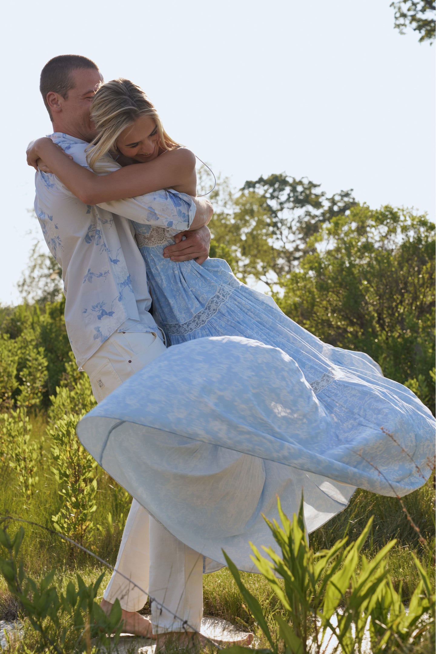 Introducing our first-ever unisex Hudley Shirt. Match your beau with this crisp, cotton poplin button down featuring our signature fragrance floral prints. With a relaxed fit, the piece arrives with a center-back box pleat for ease, a collared neckline, long cuffed sleeves, and is finished with a shirttail hem.