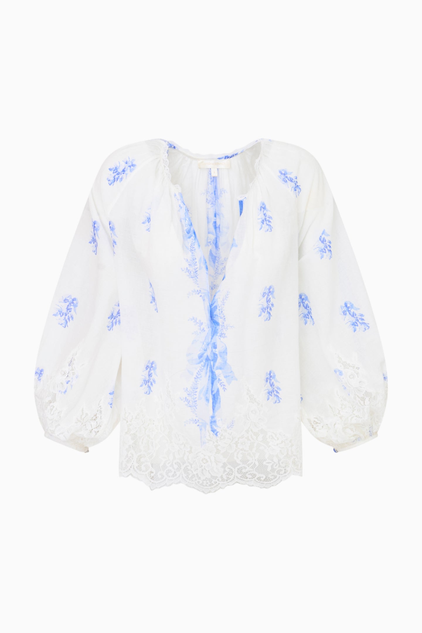 Introducing the Dresner Top. This Victorian-inspired blouse stuns with a delicate cotton voile featuring a romantic large scale floral print inspired by antique textiles. With a billowy silhouette, the piece has a v-neckline, wide laces at the blouson, elasticated sleeves, and a loose, breezy silhouette.
